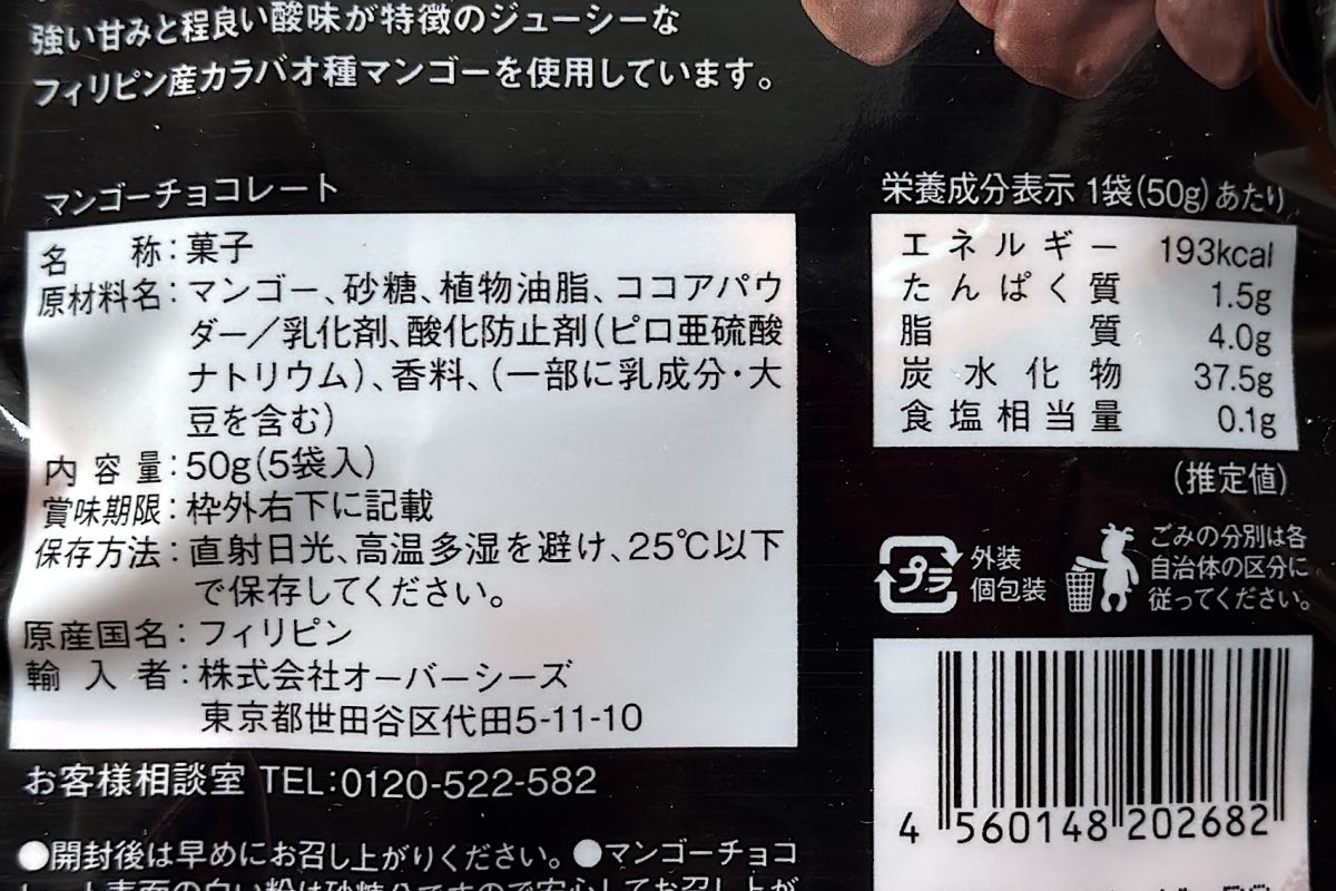 最初にご紹介するのが「オリジナル マンゴーチョコレート」5袋入り・50g 。