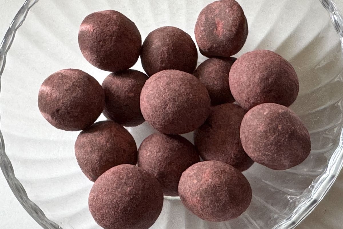 中には直径2cmほどのコロコロと丸いチョコレートが15〜16粒ほど入っています。 ひと粒ひと粒、大きさが微妙に異なります。