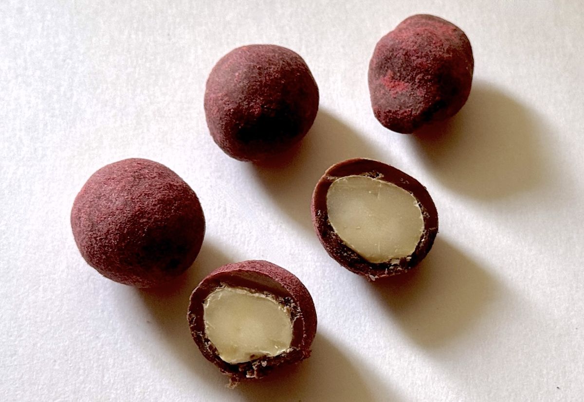 ローストしたマカダミアナッツをミルクチョコレートで薄くコーティングし、ピンク色のラズベリーパウダーをまぶしてあります。