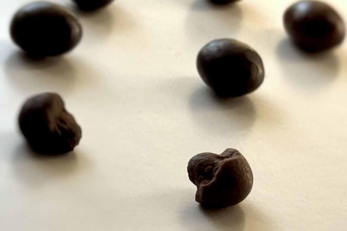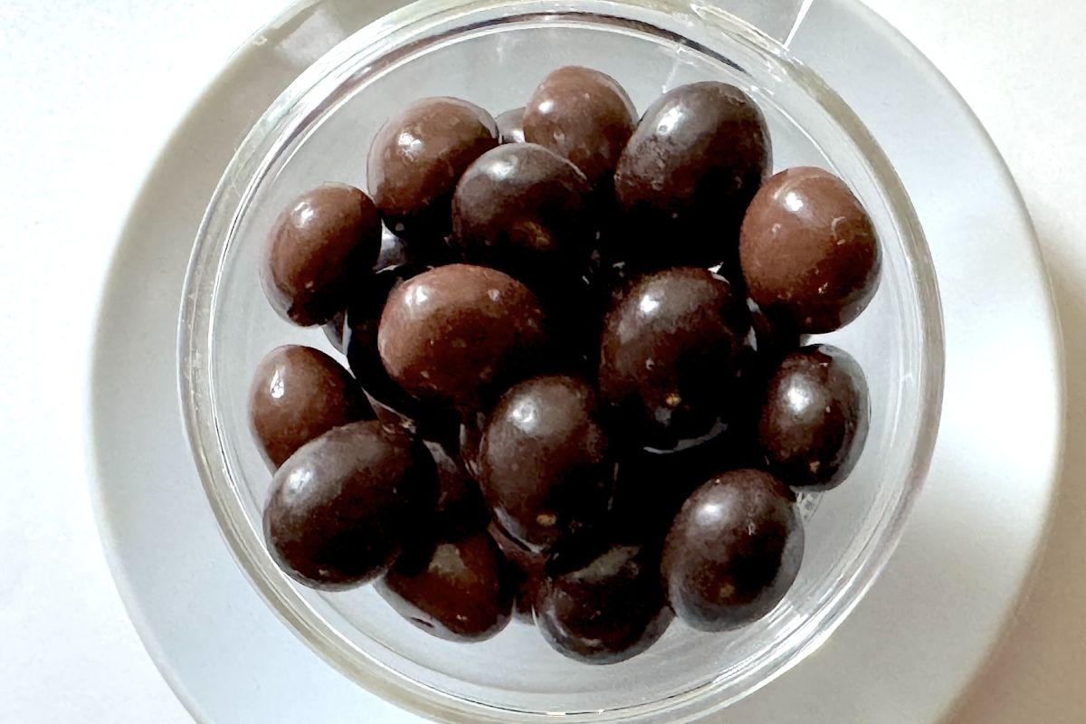 口の中で転がしてチョコレートをとろけさせた後に、カリッと噛むと、苦味の中にフルーティーさを残したコーヒー豆の味と香りが広がります。