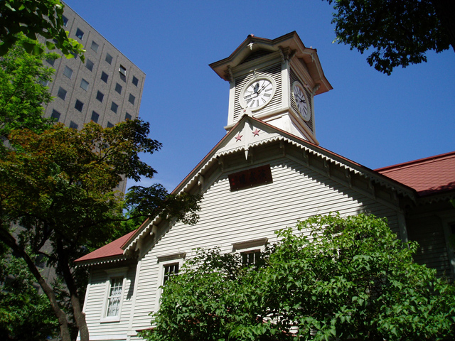 北海道大学の前身である旧札幌農学校の演武場として、初代教頭クラーク博士の提案により明治11年(1878)に建築されました。明治14年(1881)、時計塔を付設してボストン・ハワード社製の振り子式時計が設置されています。1世紀以上も時を刻み続けた時計は、毎正時に澄んだ鐘の音色を響かせて札幌の街に時を告げています。1階には、写真パネルを使って時計台の歴史を紹介する展示コーナーを設置。2階では、明治時代そのままに演武場が再現されています。国の重要文化財で、所要30分です。