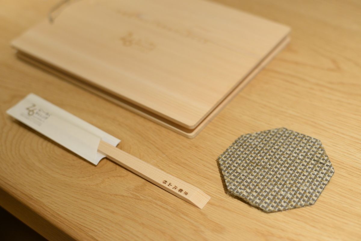店内で目を引く縄の暖簾は、京都の山並みをイメージしたもの。柱や割り箸には北山杉を使用し、木の温もりに包まれた落ち着きある空間が広がります。