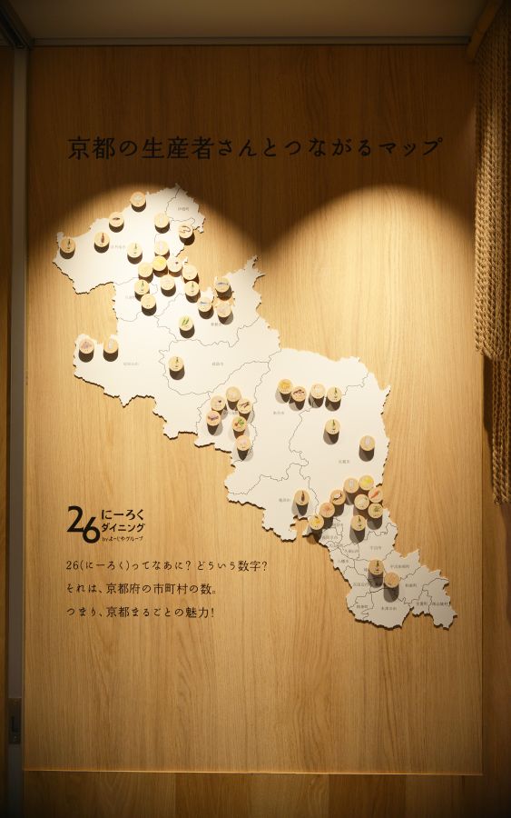 壁には京都府の地図が掲げられ、その日使われている食材の産地が京都の端材で作られた目印で一目で分かる工夫も。京都の広がりを視覚的にも感じられます。