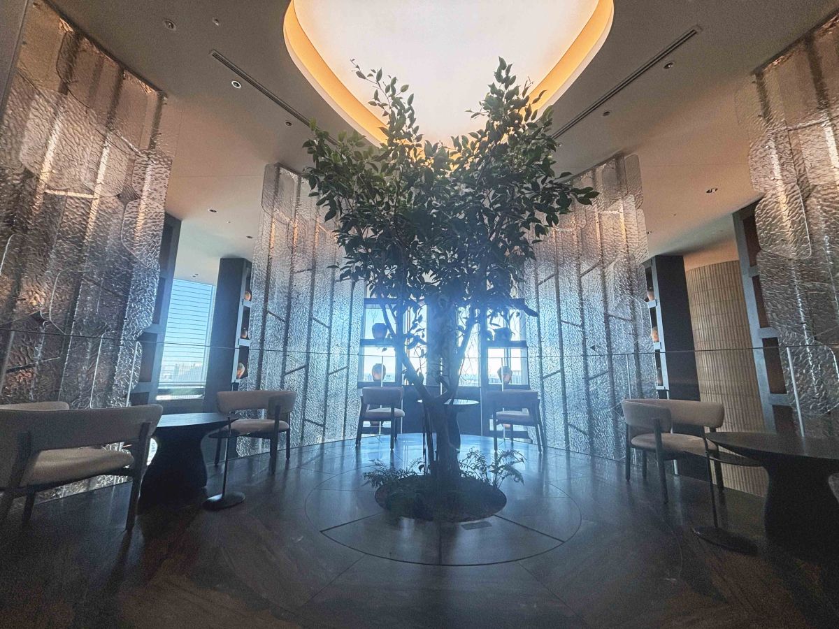 JWラウンジのなかでいちばん印象的なスペースが、こちらの「ツリーテラス」。高輪の自然の美しさを表現するため、本物の木がシンボルツリーとして植えられています。ゆったりくつろぐだけでなく、こちらでハンバーガーなどの軽食やアフタヌーンティーをいただくこともできます。