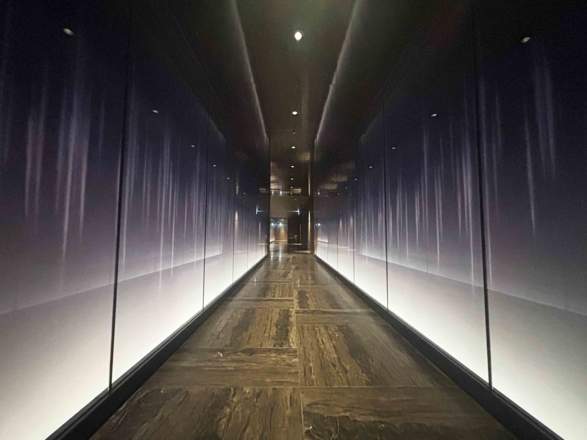 チェックインを済ませたら客室へ。あえて照明が抑えられた廊下には、白く流れる滝をイメージしたあしらいが施されています。趣のある雰囲気にお部屋への期待も高まります。