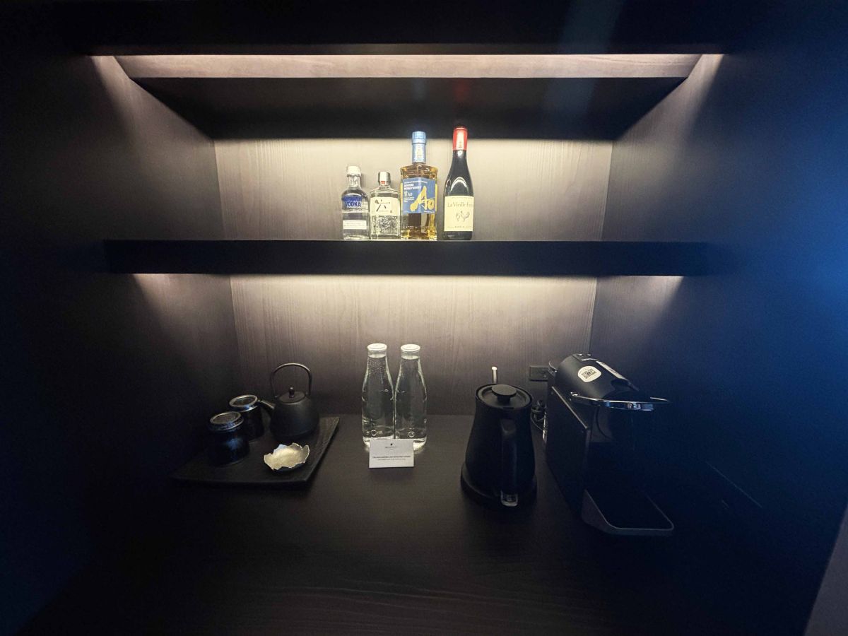 メインルームに続く廊下には、ミネラルウォーターやポットが置かれているティーセットコーナーがあり、下の引き出しの中には、お茶やコーヒーが入っています。