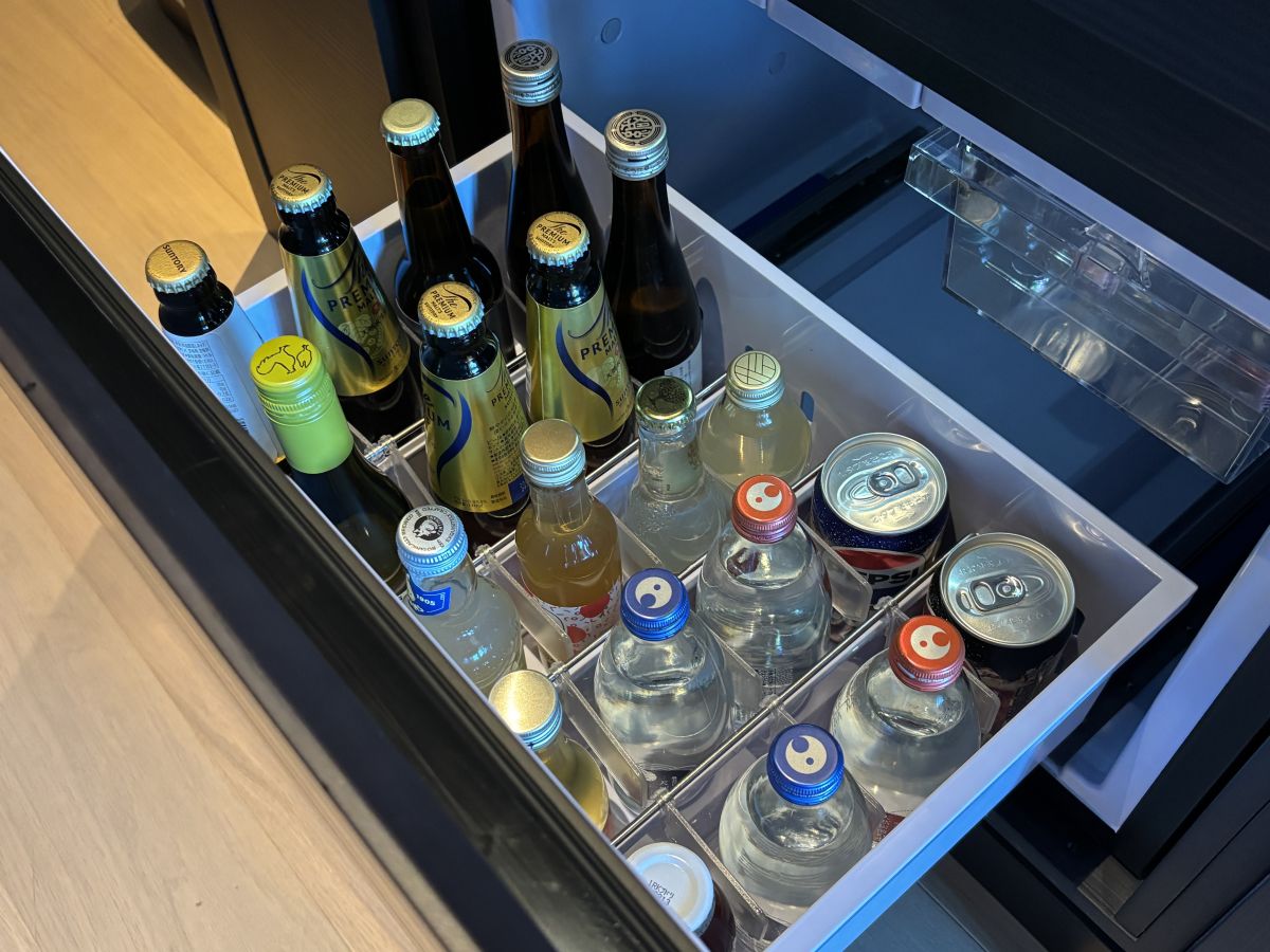 冷蔵庫には、レモネードやフルーツソーダー、ビールなどが勢揃い。別の引き出しには、ミックスナッツやチーズサンドなどのスナックも用意されています。(※利用の際は別料金がかかります)