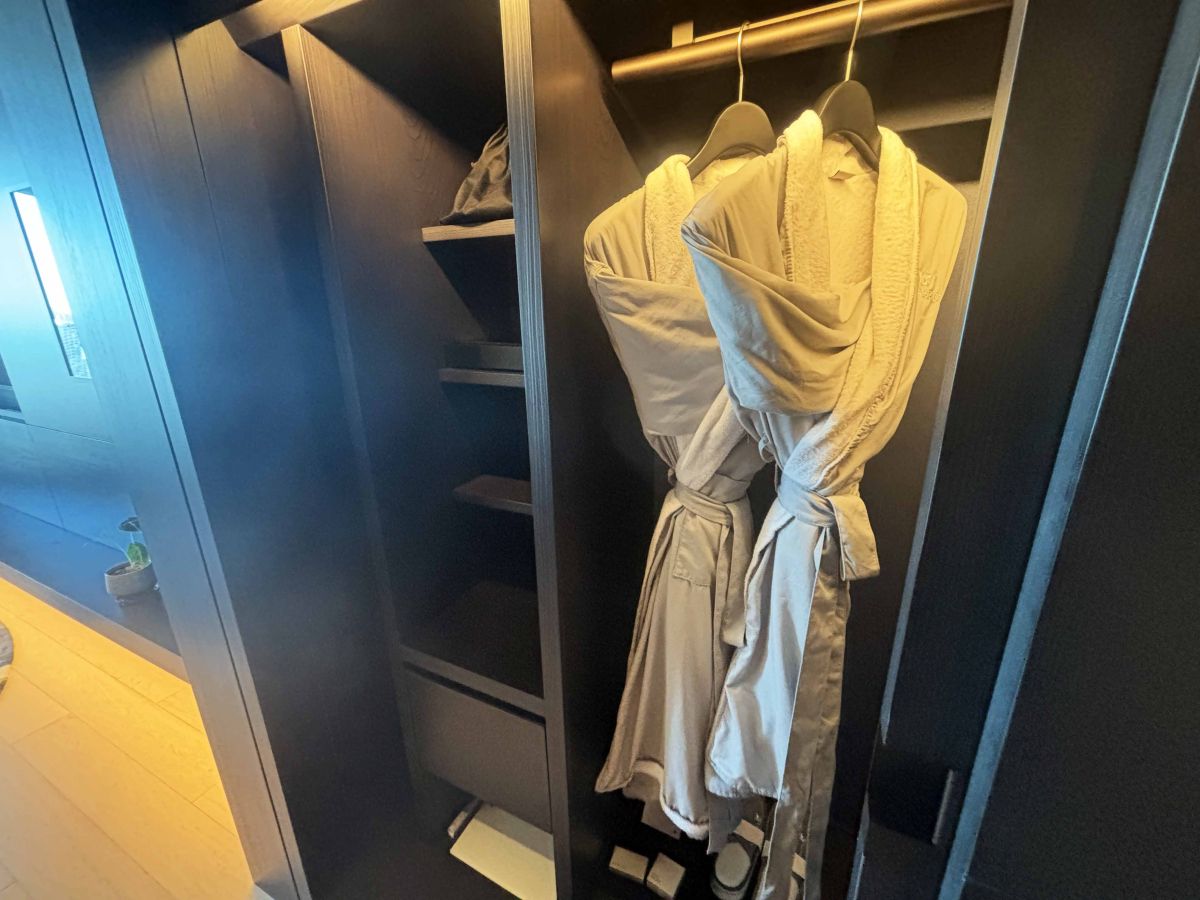 クローゼットにはバスローブやパジャマが。自由に使えるアイロンやブラシも用意されていて、旅先でも洋服のお手入れができるのもうれしい。