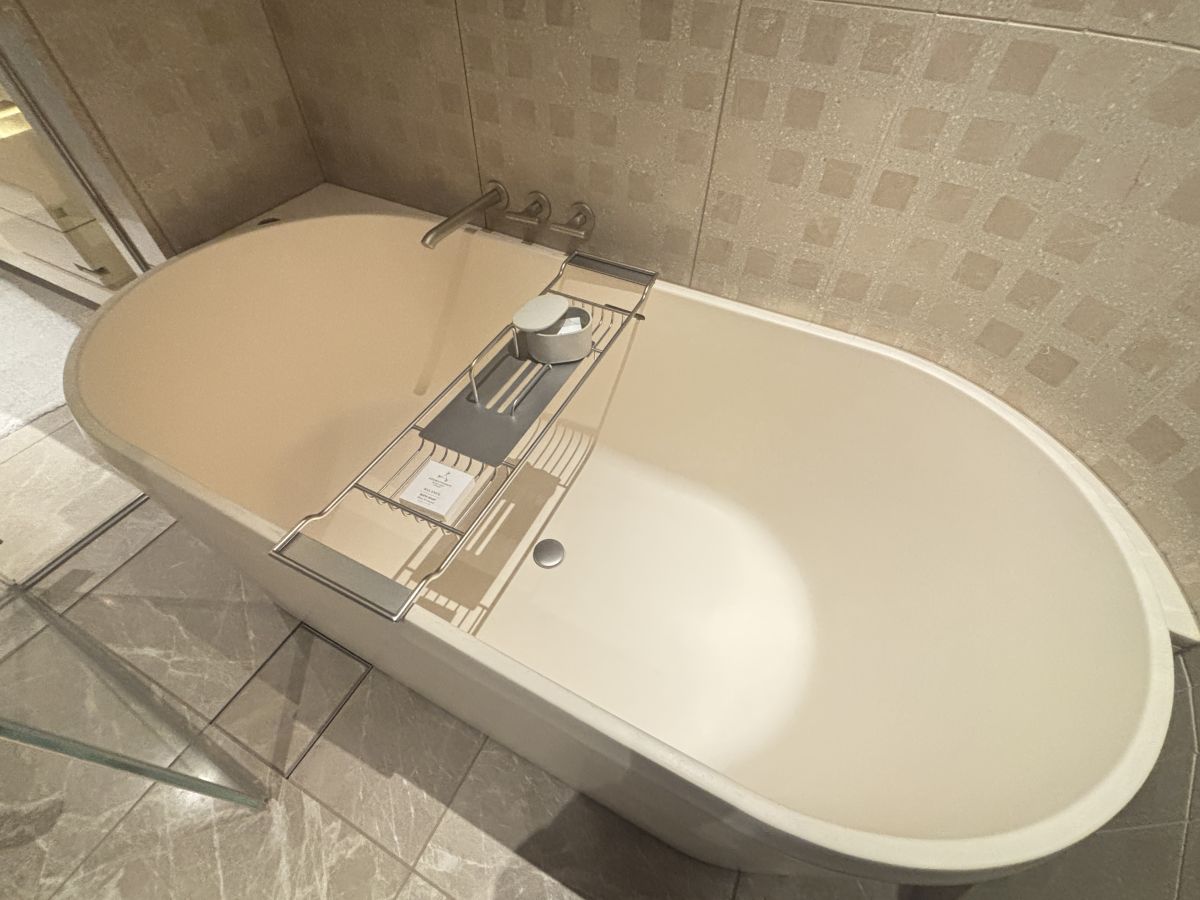 浴槽には便利なバスラックも。アロマバスソルトが用意されていて、旅行の疲れをしっかり癒せます。