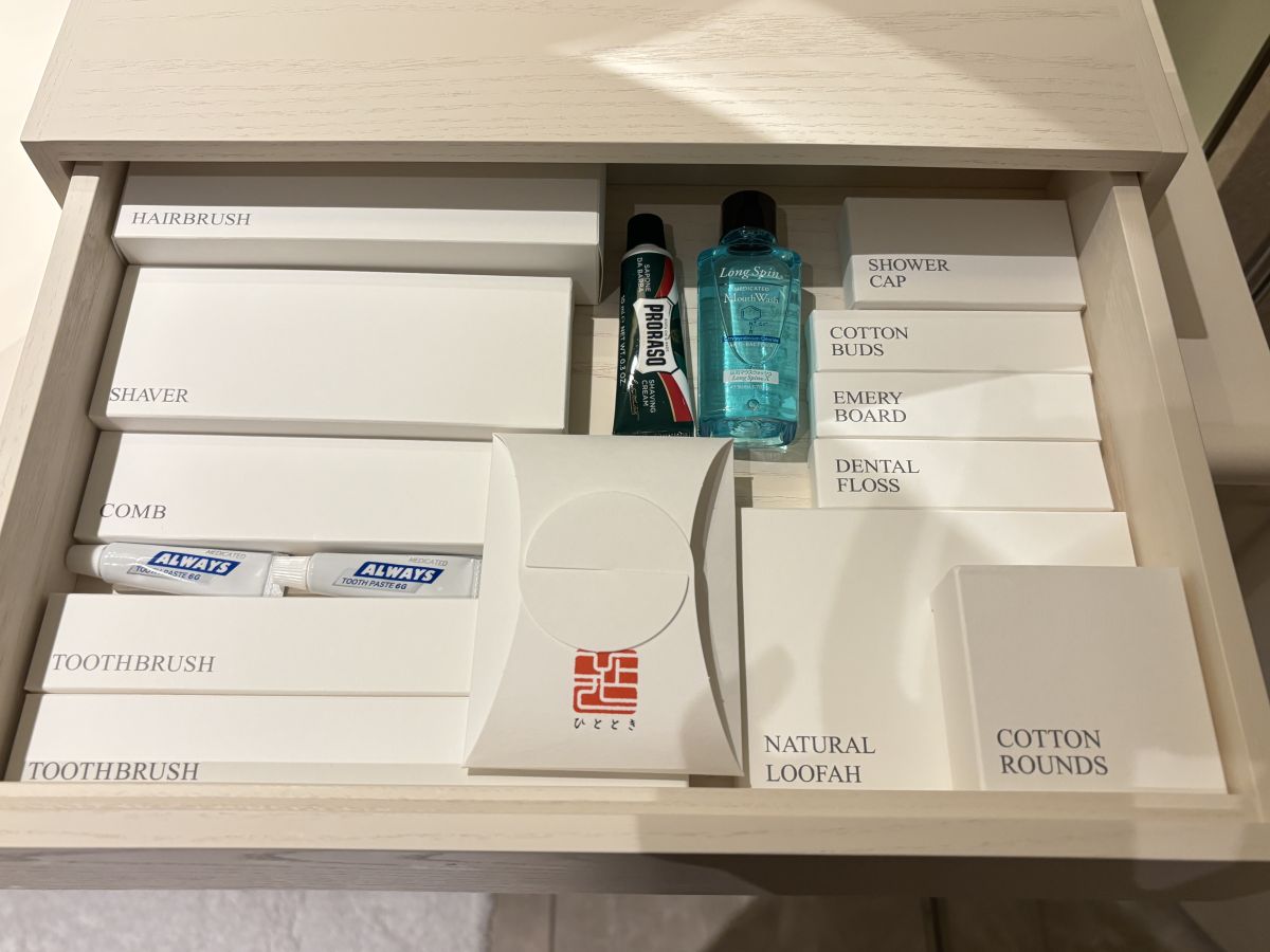 シンクの下の箱にはアメニティがぎっしり。歯ブラシやクレンジング、ヘアブラシのほかに、マウスウォッシュやシェービングクリームまでありました。
