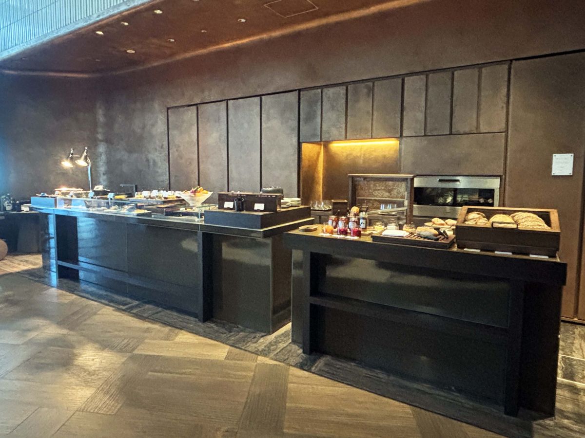 メインディッシュと一緒に楽しめるビュッフェは入口の近くにあります。パンやサラダ、ヨーグルトなど洋風のメニューから、お味噌汁や小鉢系の和風メニューまでよりどりみどりです。