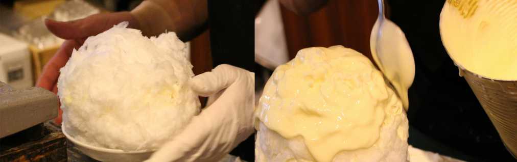 ドルチェ氷は見た目の通り、ケーキのような工程で作られます。ホール形に整えた氷に、生クリームをコーティング。思わず見とれてしまうのはその素早い手つき!カウンター席からは完成するまでの様子が見えるのでオススメです。