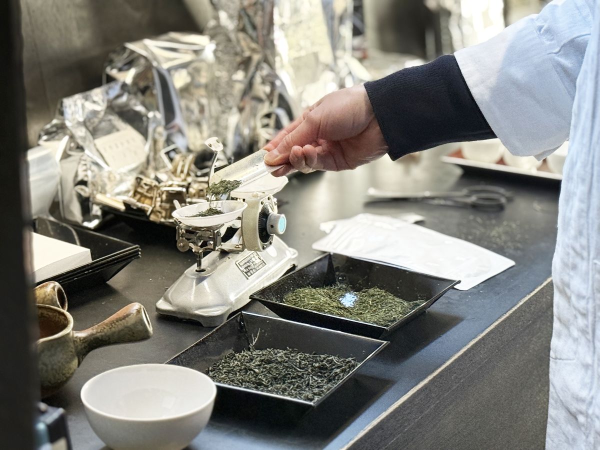 さきほど試飲した3種類のなかで気に入った味や香りを伝えて、茶葉の配合を決定します。計りを使って繊細な茶葉の割合を決める様子はまさに職人技。