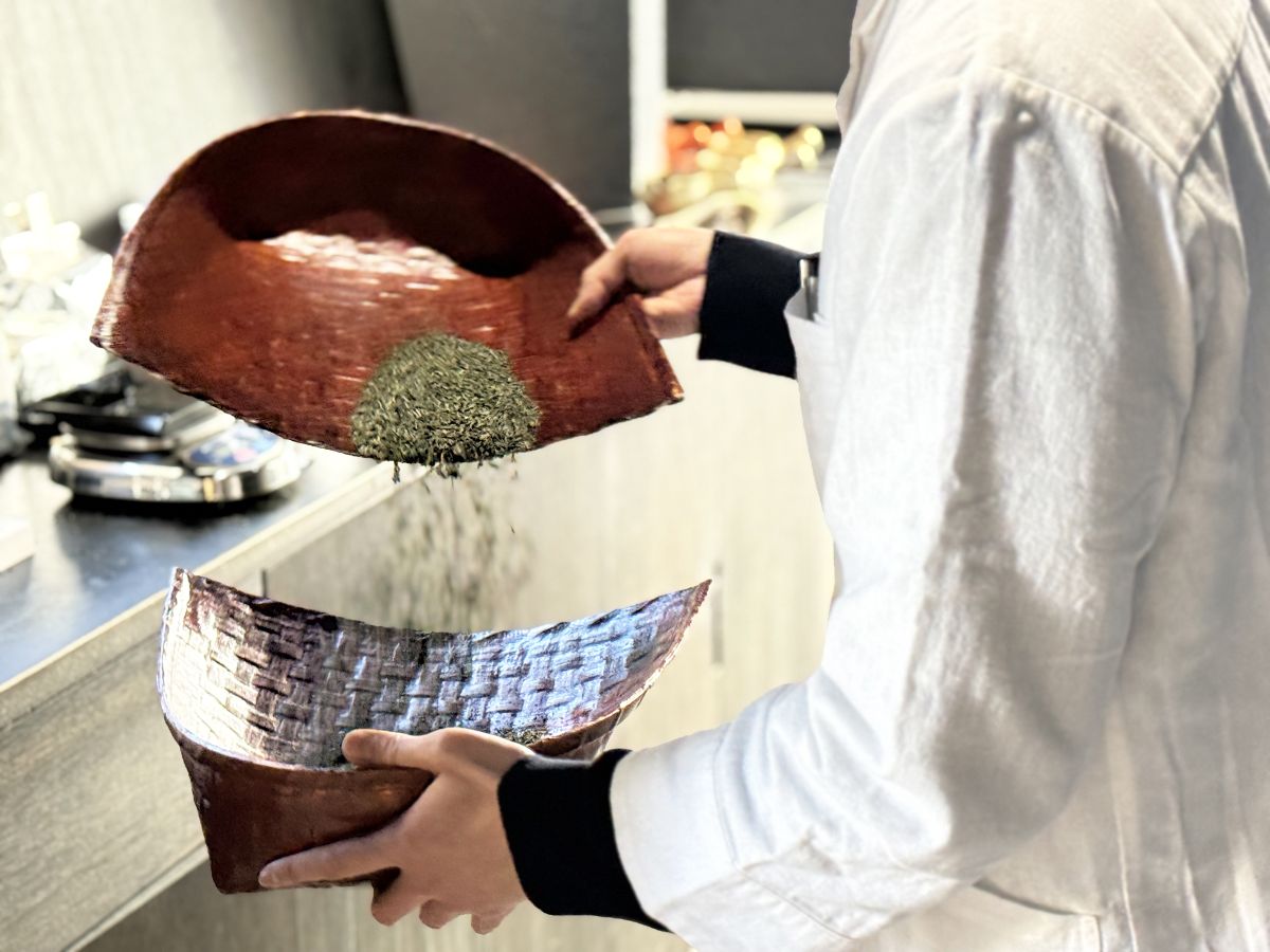 最後の2種類を飲んだ感想を伝えて、いよいよマイブレンドを完成させます! 待っている間は、箕を振って合組する様子を間近で見ることができます。京都の渋柿仕上げの箕は流通が少なくなっているので、お目にかかれるのも貴重。サラサラとして心地よい音が癒されます。