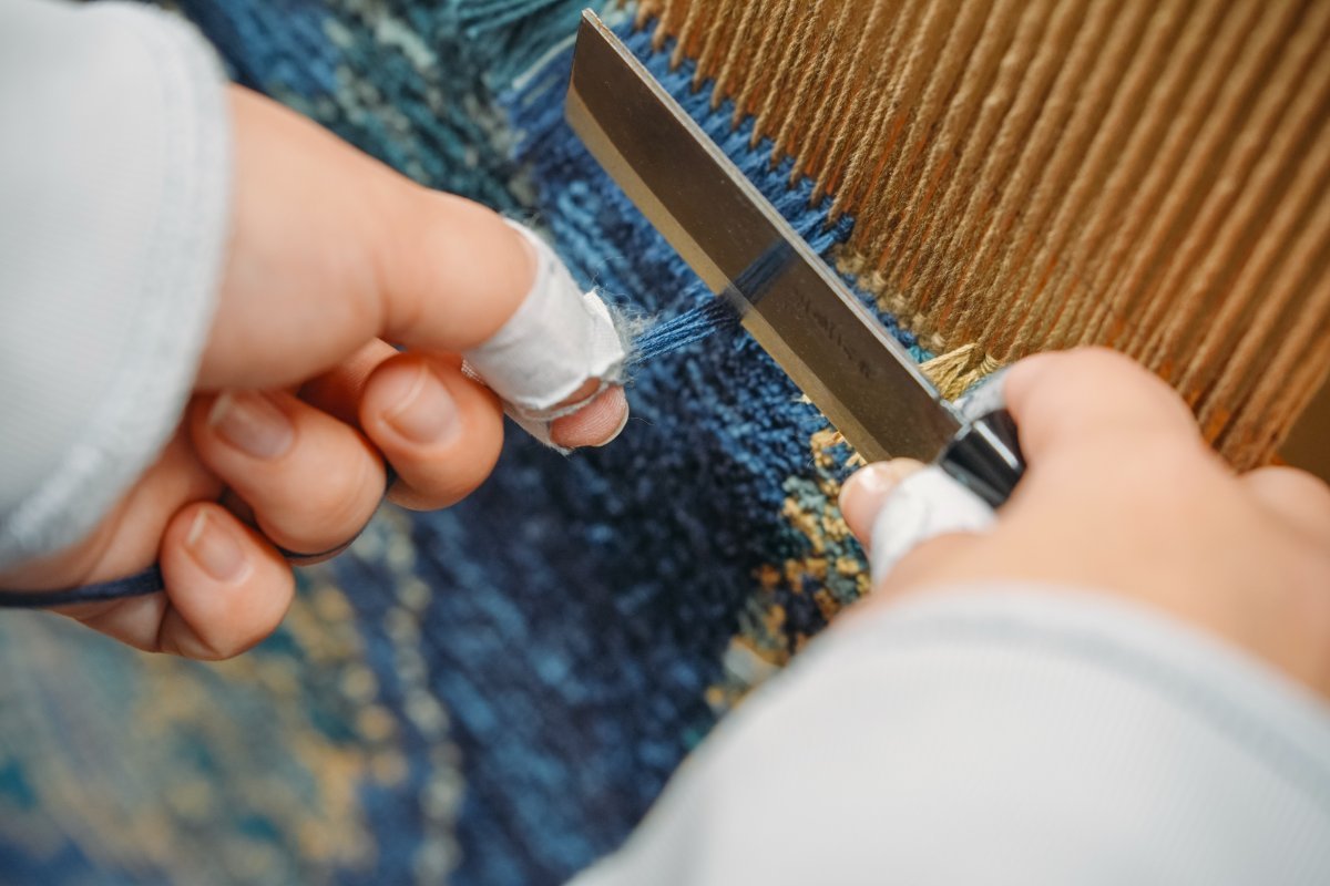 一段結ぶと緯糸(ぬきいと)通し、締め金という大きな櫛のような道具で打ち付けて目を揃えるので、締め金を叩く音が定期的に工房に響きます。これを繰り返していくつもの糸を結び、美しい柄の絨毯が織り上がるのですね。