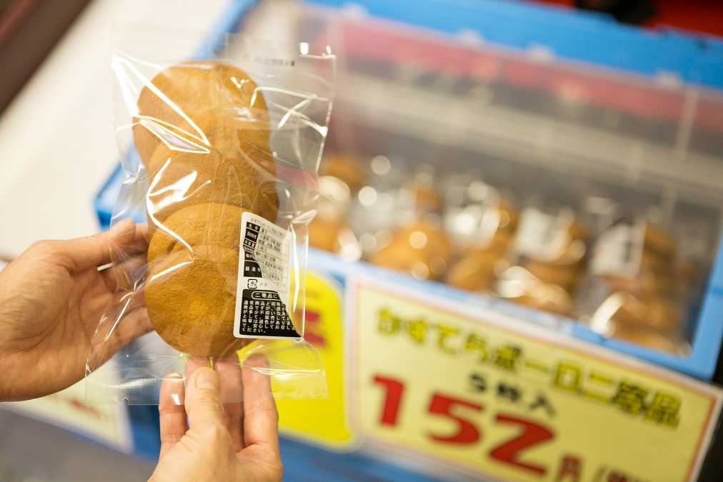 2軒目は、カステラでおなじみの「文明堂」。ほんのりと香ばしく、優しい甘さが魅力の「かすてらボーロ」は5枚入りで152円と、とってもお買い得です。