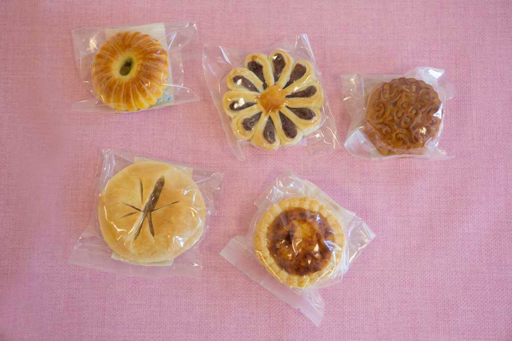 中華菓子は、左上から時計回りに、「南瓜酥(ナンクアス)」90円、「菊花酥(ジューファス)」80円、「五目月餅」250円、「開花酥(カイファース)」110円、「椰達(イエタ)」150円。1個から購入できるので、いろいろな味を楽しめるのもうれしいですね。