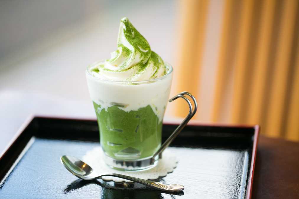 店内には喫茶スペースもあり、おいしいお茶はもちろん、スイーツメニューも豊富。写真の「プリンソフト」(420円)は、とろける抹茶プリンとソフトクリームのハーモニーが最高。ソフトクリームに“ムセるほど”抹茶を振りかけた「ムセ抹茶」(340円)もおすすめです。