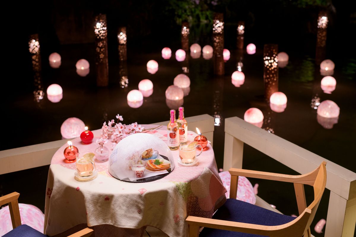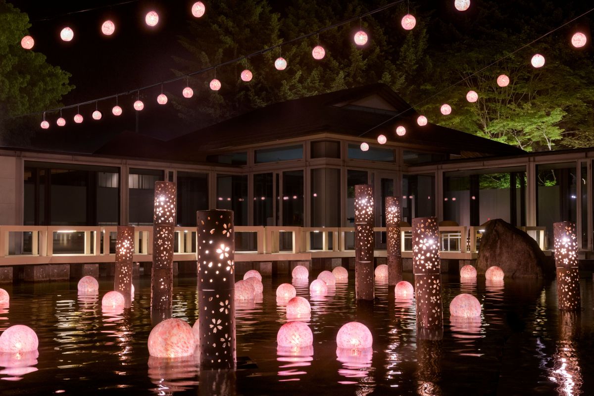 「界 津軽」の象徴であり、津軽文化と四季を感じられる「津軽四季の水庭」。「春待ち桜あかりテラス」のイベント期間中は、津軽地方の伝統工芸品「津軽びいどろ」と「津軽金山焼」の灯篭をしつらえて、ひと足早い春の訪れを表現しています。満開の桜が夜を照らす「花明かり」をテーマに、華やかで幻想的な空間が楽しめます。