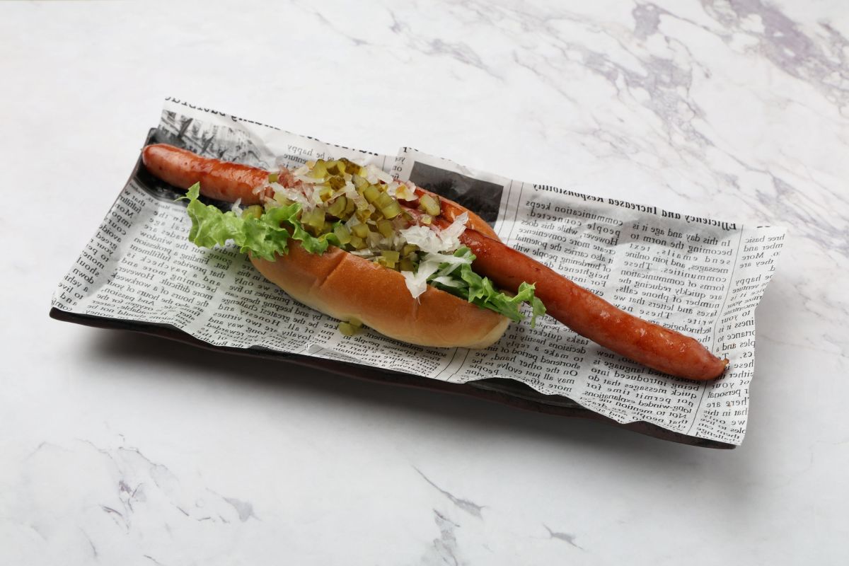 野球のバッドをイメージしたホットドッグ。パンからはみ出るほどのボリュームで食べ応えもばっちりです。