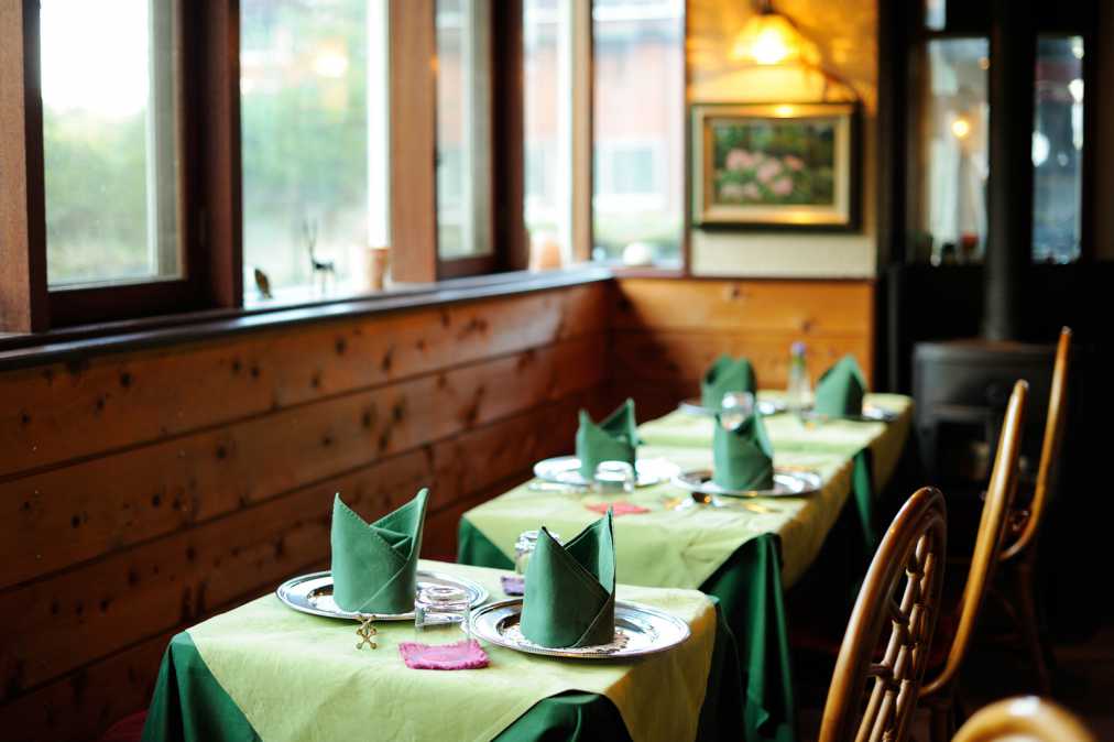 ペンションの玄関とは別に、半地下のような少し低い位置にレストランの入口があり、中に入るとこぢんまりしたレストランスペースが広がっています。