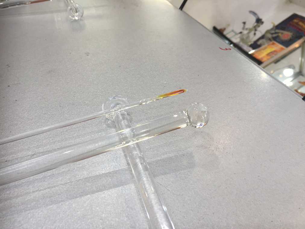 先端が黄色いガラス棒には銀が入っており、バーナーでかける温度によって、低い順から紫→青→黄色→白と色が変化するとのこと。この時点ではできあがりがまったく想像できません!