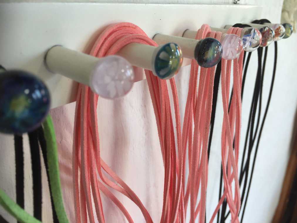 最後に、紐を通すための穴の部分を作ります。できたガラス玉に別のガラス棒を熱しながら接着し、キリを使って穴の形を少しずつ整えたらバーナー作業は終了!ネックレスにするための革紐を選びます。