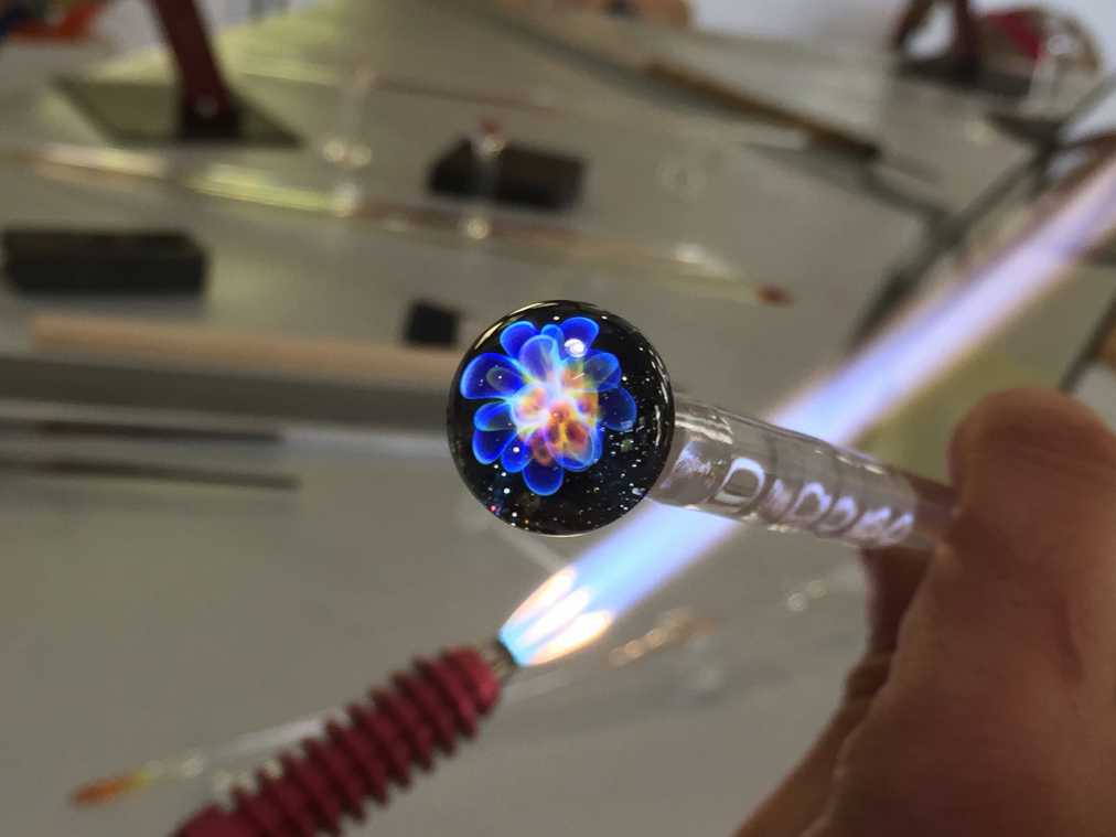 オニキスパウダーを付けて仕上げると、そこにはまるで宇宙のように神秘的なガラス玉が!透明のガラス球にただガラス棒を刺していっただけなのにこの輝きと模様。思わず胸がときめきます。