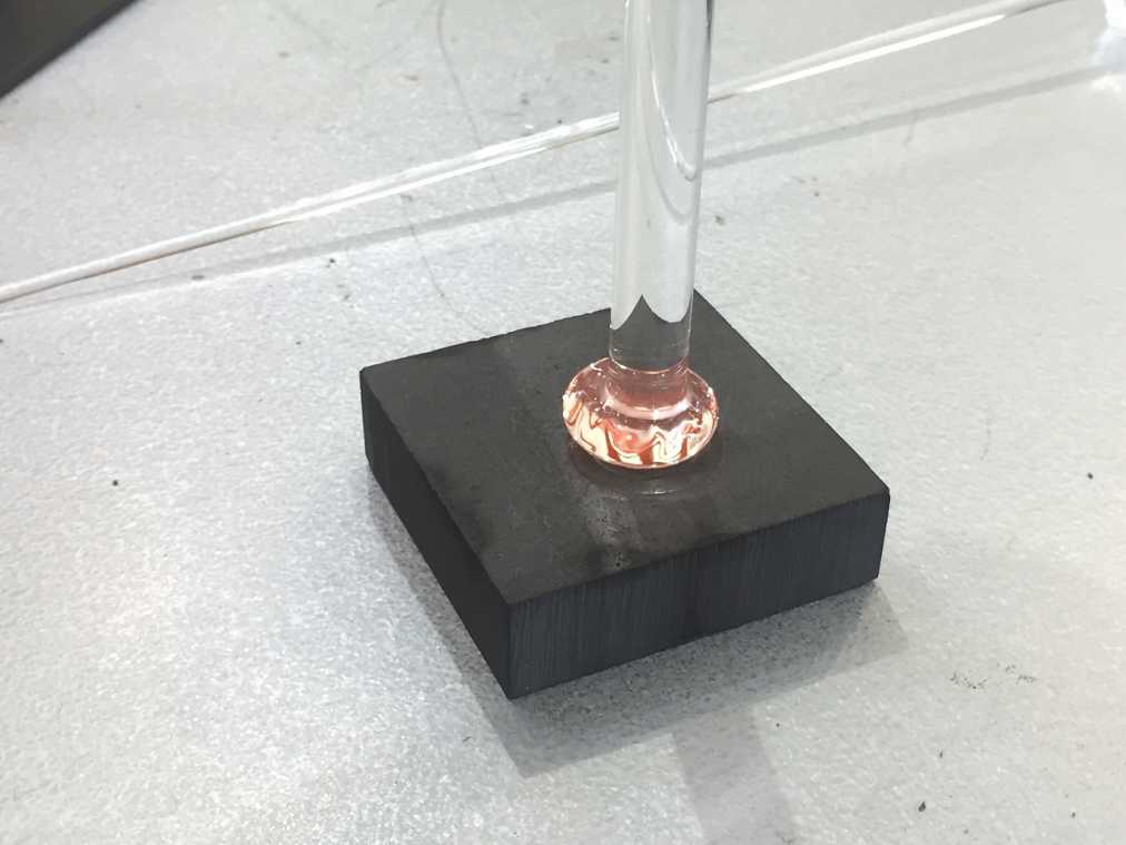 バーナーで熱を加えてガラスをやわらかくしたら、台にムニュッと押し付けて平らにし、土台を作ります。固かったガラス棒が簡単に変形するのが面白い!