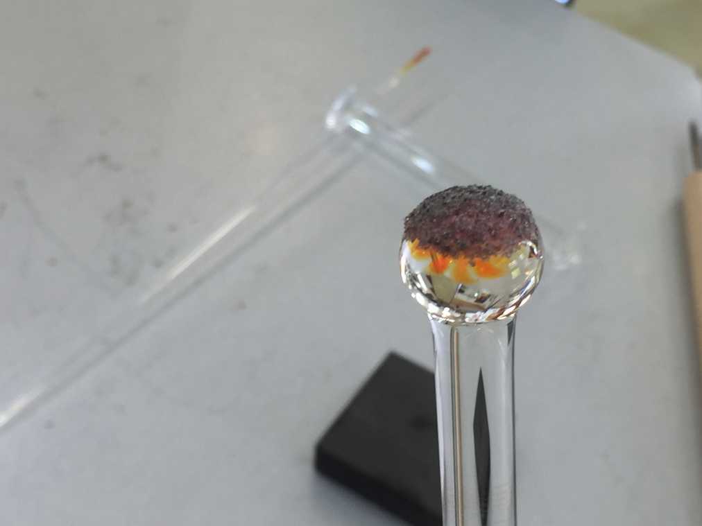 今度は銀入りのガラス棒も一緒に温めて、ガラス玉にポツポツと刺しドットを書いていきます。この段階では何がどうなっているのかサッパリわからないのですが、何度も繰り返していくうちに集中モードに。ガラスにガラスを刺す感触がなんとも独特で、これはハマります。