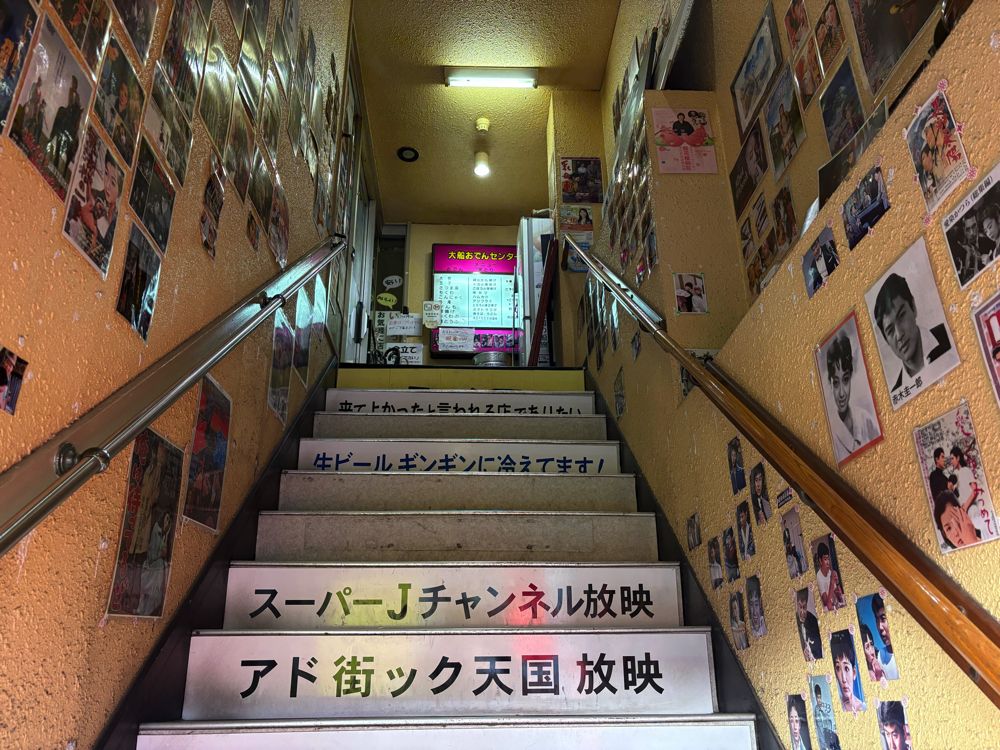店の入口にある階段を上ると、両面に昭和スターのブロマイドなどズラリ。そこはかとなく漂う昭和ムードが、非日常感を誘います。