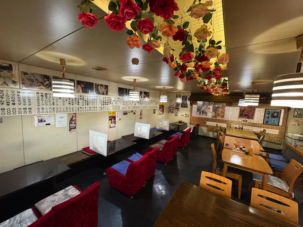 店内に入ると、さらに昭和ムードがアップ。壁面に飾られたブロマイドや懐かしの映画ポスターのほか、椅子やテーブル、メニュー板などのディティールも昭和そのもの。まさにノスタルジーに浸るための空間といった趣きです。