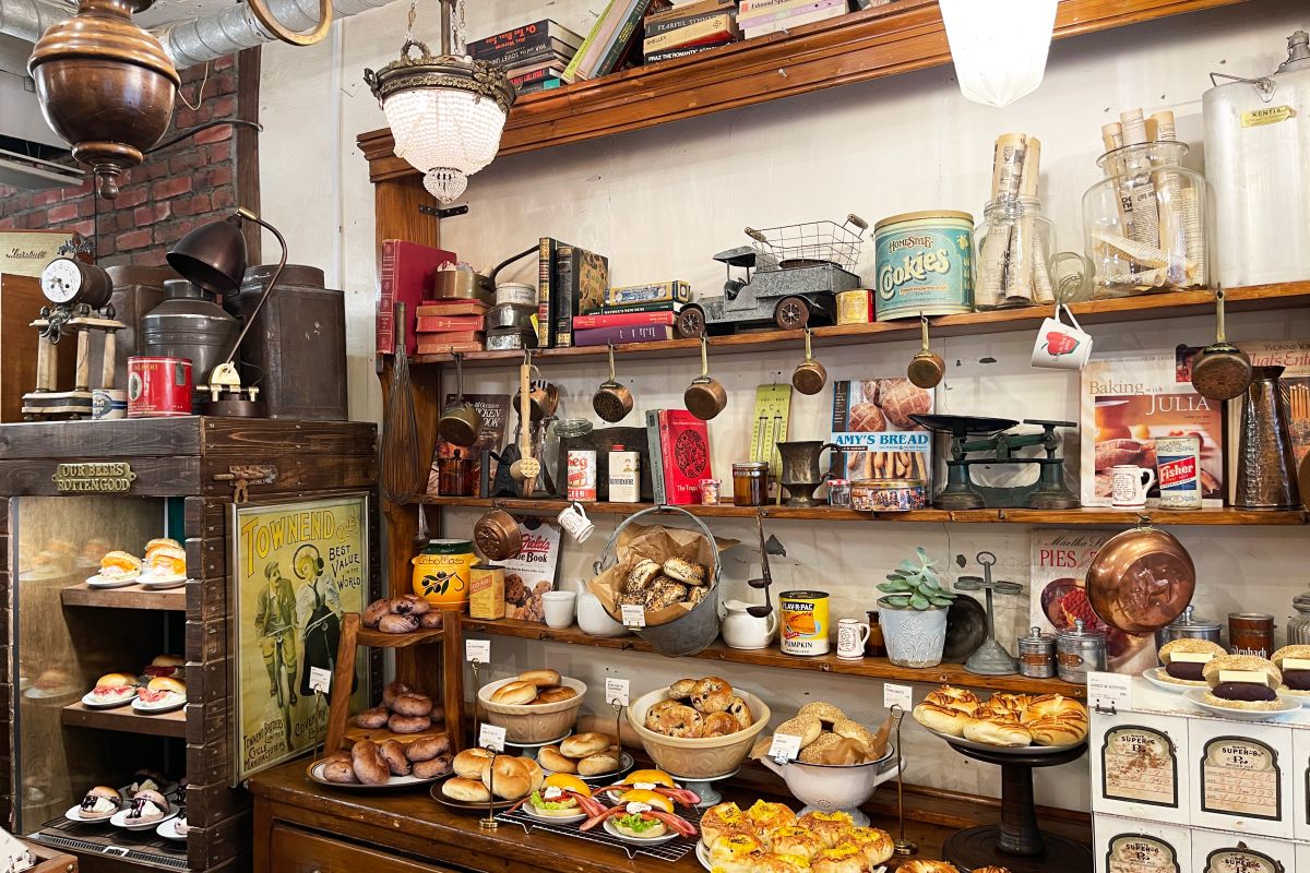自分の趣味や嗜好をたっぷり詰め込んだベーグルを、アトリエで研究するように作る、そんなストーリーがこの空間には込められているんだとか。ほとんどをDIYで作ったという内装は、女の子が育ったアトリエをイメージ。ヴィンテージ感あふれる空間にキュートなベーグルがずらっと並び、お店に入るだけでもワクワクします。
