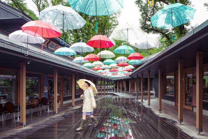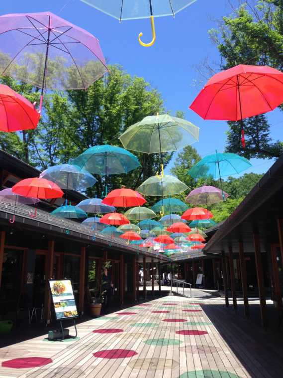 レストランや雑貨店が並ぶハルニレテラスの頭上を彩るのは100本の傘!晴れた日には、日差しでウッドデッキに傘の色が投影され、カラフルな模様の歩道に変身!