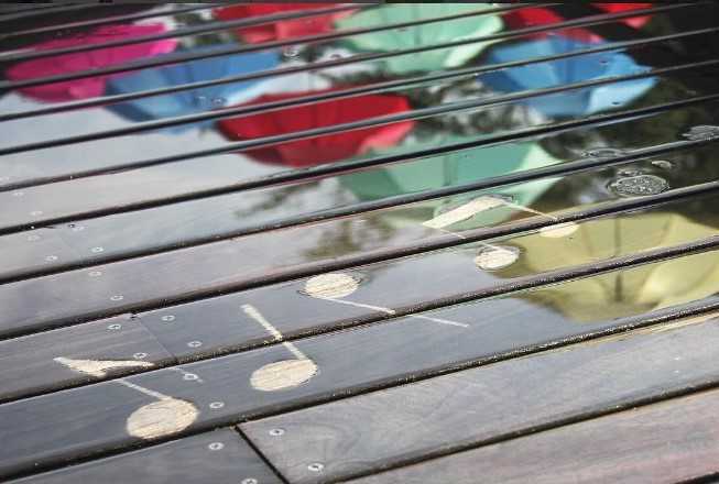 さらに、ウッドデッキには、雨に濡れると音符や葉っぱを象った模様が現れる仕掛けが施されており、雨の日だけに現れる「レイニーアート」が楽しめます。8~21時。