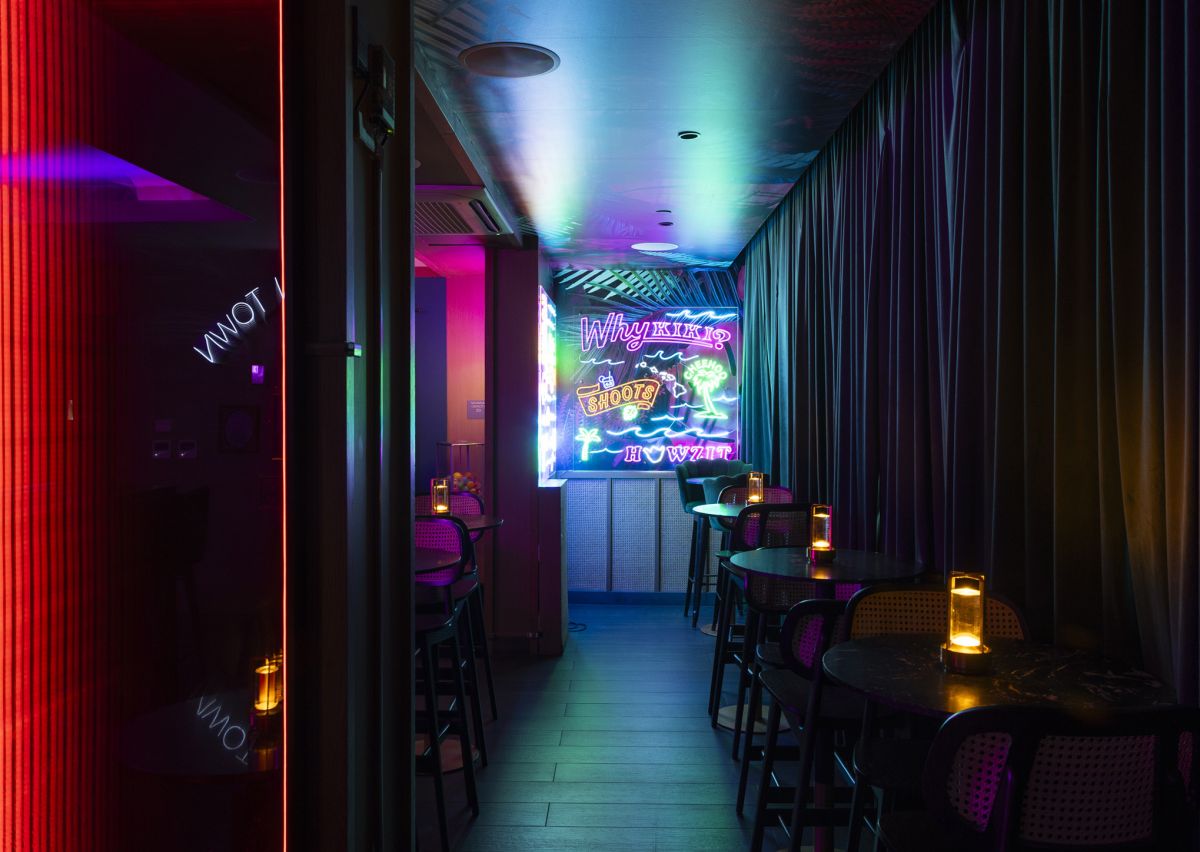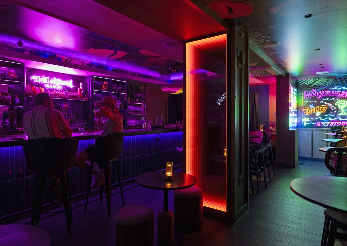 一歩店内に入ると、そこは別世界。ピンクやグリーンのネオンが輝く独特の雰囲気は、トロピカルでレトロシックな魅力に満ちています。ミッドセンチュリーのエッセンスを感じさせる洗練されたバーには、カウンター席のほかにくつろげるラウンジ席もあり、シックに楽しみたい夜にもぴったりです。