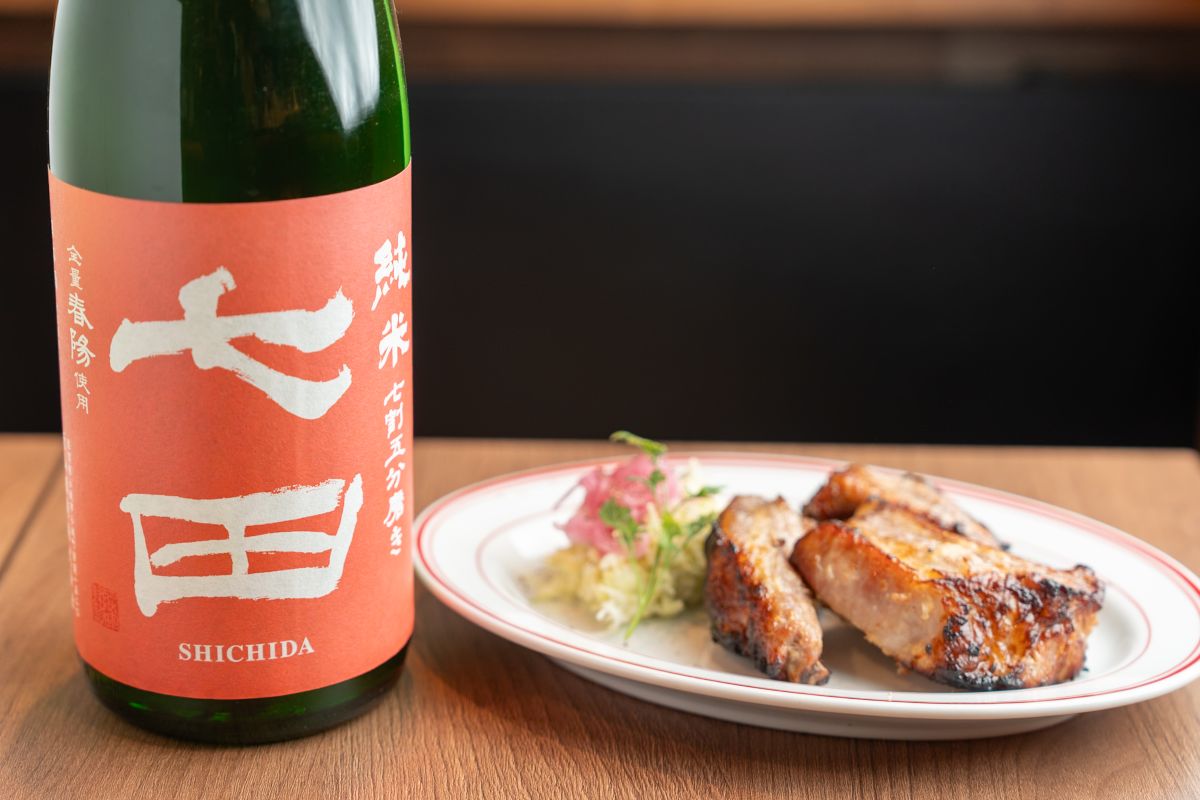ガッツリ系のこちらのお料理には、取材時当⽇に⼊荷したばかりだという「七⽥」125ml 880 円をおすすめしてくれました。こちらも信頼をおく限られた販売店にしか卸してくれないというレアな⽇本酒。やさしい⼝当たりで、ほのかにライチやグレープフルーツのニュアンスも感じられる純⽶酒です。
