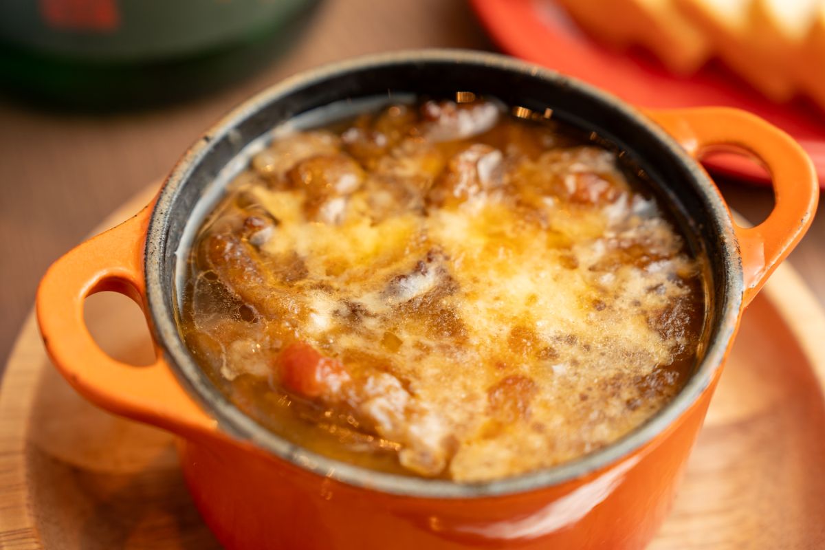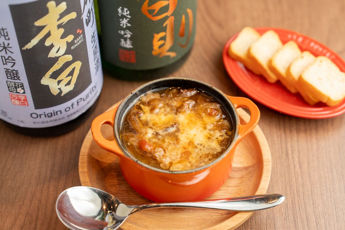 バゲットがどんどん進む濃いめの味付け。キレのある⽇本酒と⼀緒にいただけば、また濃厚な煮込みが⾷べたくなり、さらに⽇本酒をちびりと…。まさに無限ループで酔いも回ってきました。
