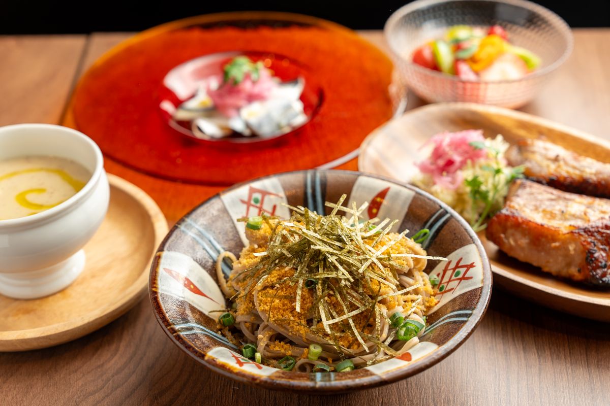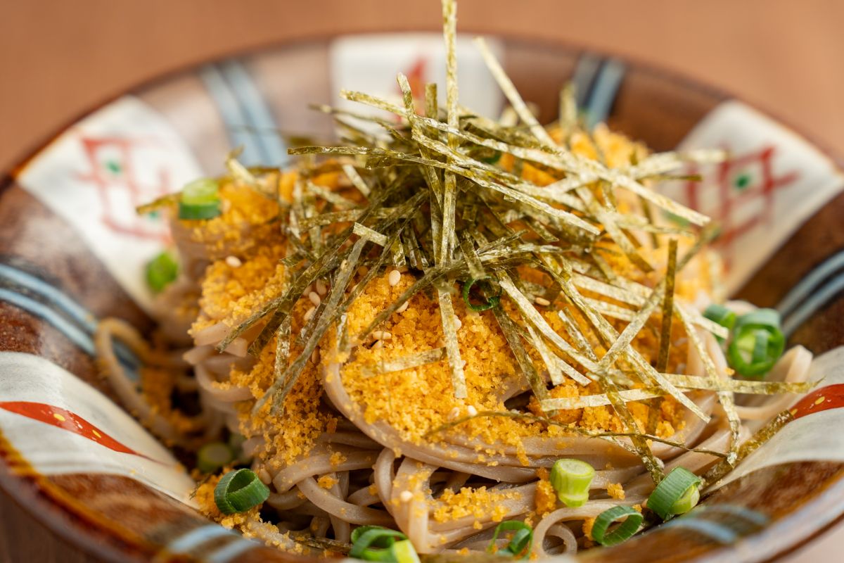 締めでいただきたいのが「からすみ蕎⻨」2420円。⻩⾦⾊に輝くからすみをぜいたくにそばにオン! そばと⽇本酒が合うのは⾔わずもがなですが、さらにからすみという強⼒なサポートも相まって、お腹はすでにパンパンでしたがペロリと平らげてしまいまいた。ぜひ締めにオーダーしていただきたいひと品です。