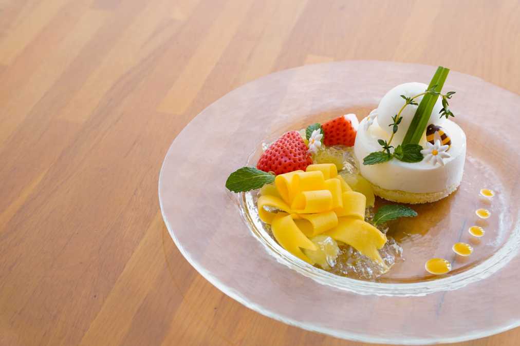 さわやかな甘さのソルベが乗った「リフレッシュハーブ香るクレームダンジュ タイムヨーグルトのソルベを添えて」1782円。フロマージュブランのムースの中には特製のリフレッシュハーブのゼリーが。フルーツのコンポートが華を添えます。【軽井沢 万平ホテル】