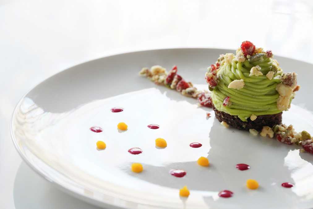 豆乳バニラアイスクリーム入りの「アボカドのモンブラン」1080円。アボカドクリームは、ゆずとココナツオイル入りでさっぱり。砂糖不使用なのもうれしい!※ランチ・ディナー利用者限定・要予約【野菜がおいしいレストラン 軽井沢ホテルロンギングハウス】