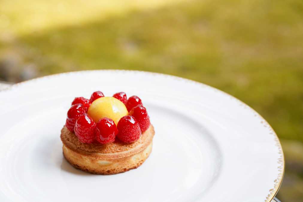生地のなかにもラズベリージャムが入った甘酸っぱい「タルトレット パッション フランボワーズ」530円。パッションフルーツのババロアを囲むように木苺が彩る、色鮮やかなタルトです。【ホテル軽井沢エレガンス】