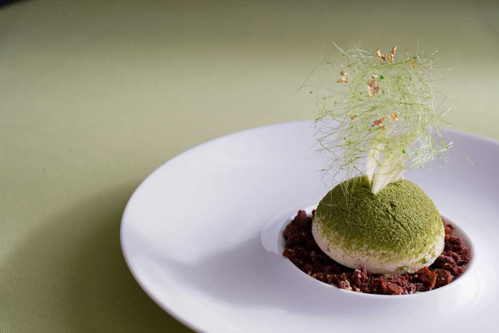 大地をイメージしたクランブルの上に、ボンブ型ケーキがのった「ホワイトチョコレートと抹茶ムースのボンブ」840円。金箔を散らした飴細工の繊細さも写真映えしそう!【ホテル 鹿島ノ森】