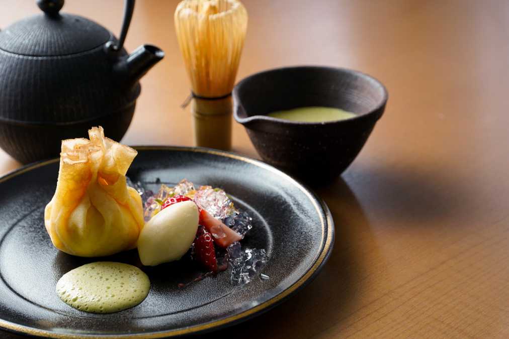 クレープ生地の中には、濃厚なクリームチーズと酸味のある信州アプリコットジャム。ソースは、カスタードクリームベースの抹茶を自分で点ててお好みで。「ふわふわクリームチーズの茶巾仕立て 宇治抹茶の香りと共に 軽井沢マリオットスタイル」1188円。【軽井沢マリオットホテル】