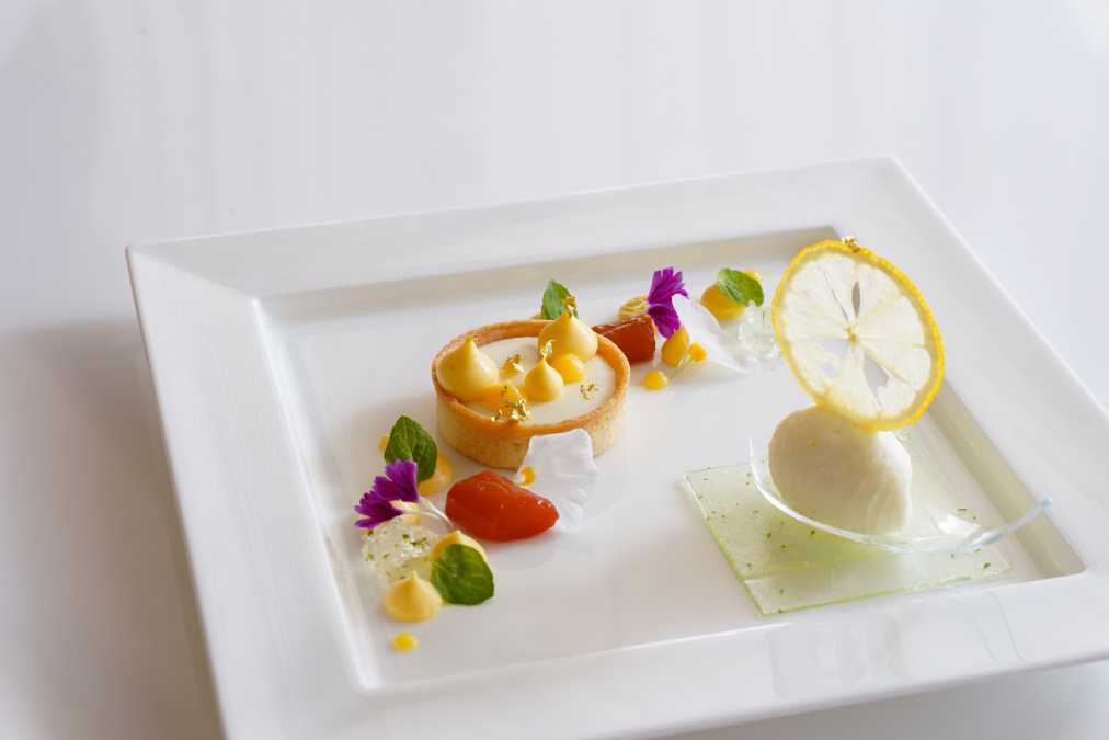 ホワイトチョコムースのタルトや、レモンシャーベット、ルバーブのコンポートなどがプレートの上で美しく共演する「KOMOREBI」990円。ネーミング通り、森の中に差し込む木漏れ日に似た爽やかさがそこに。【軽井沢プリンスホテル】