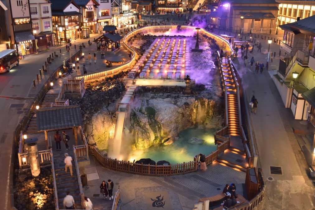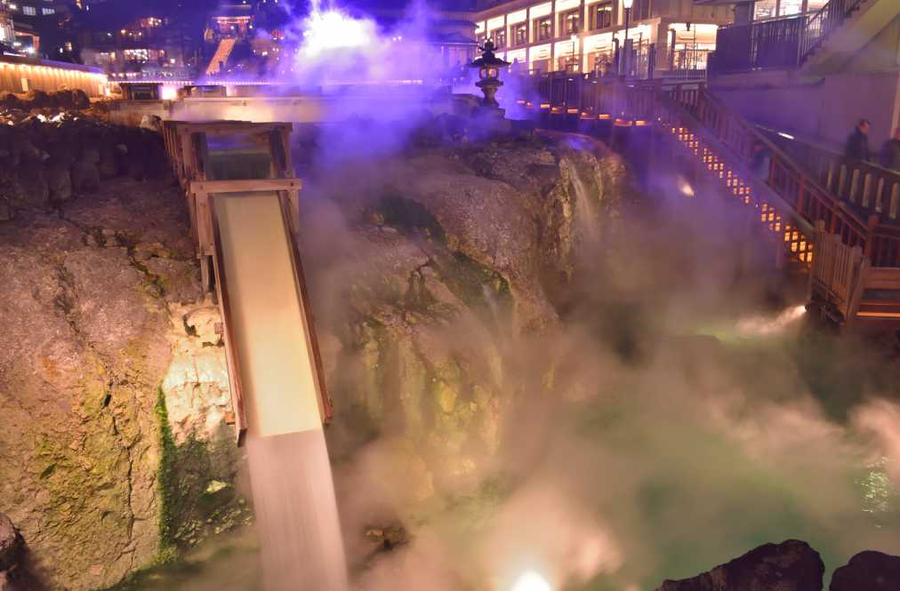 暗闇の中で紫、青、白……と時間ごとに多彩な色に照らし出される様子はついつい見入ってしまうほど。立ち上る湯気と相まって、より幻想的な風景を生み出します。