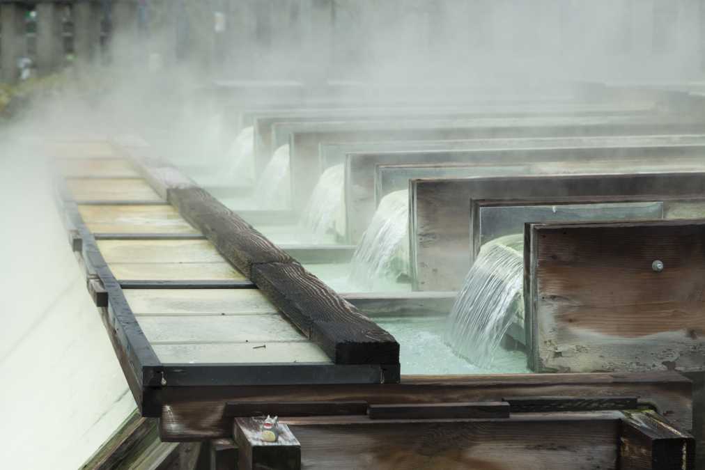 湧き出た熱々のお湯は、7本の長い湯樋(ゆどい)を通り、湯滝となって滝壺へ流れ落ち、温泉宿や足湯などに送られる仕組みになっています。