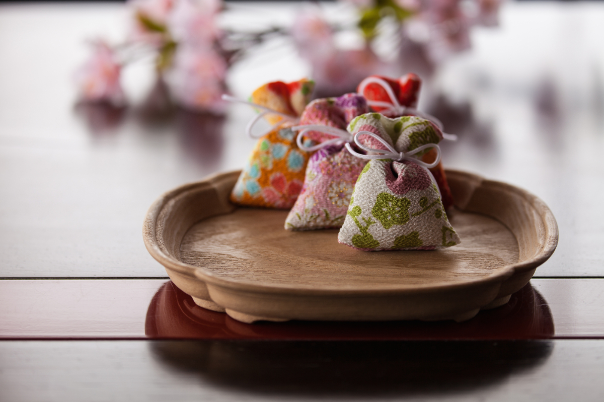 まずは、平安貴族の文化に触れる枕香づくりの体験からご紹介。創業300年以上の歴史を持つ京都の老舗香木店「山田松香木店」監修のもと、「土のぬくもり」や「若芽の息吹」といった春待ちをテーマにした数種類の香原料を自由に調合し、世界に一つだけの香りを作ることができます。春の象徴である「桜」や「梅」をあしらった上質なちりめん袋に収めて完成! プレゼントにしてもよろこばれそうです。