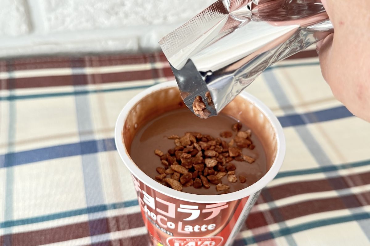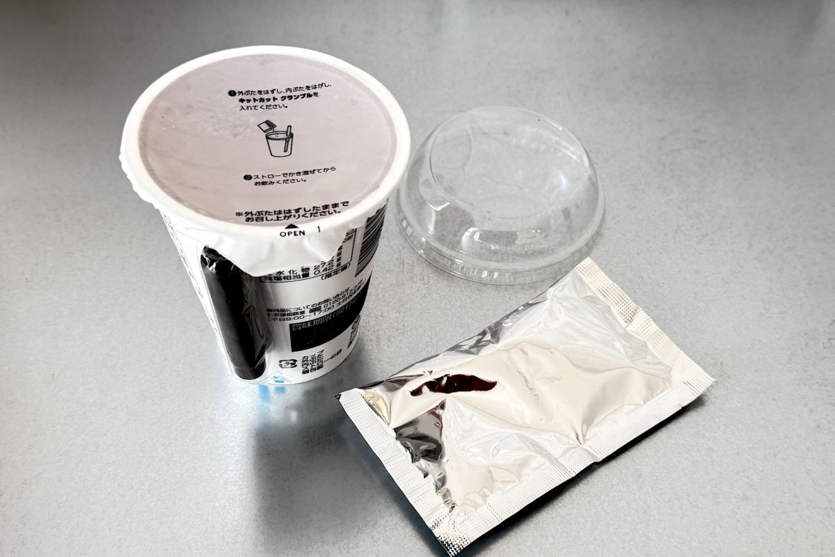 カップをよく振ってから内蓋をあけ、「キットカット クランブル」を投入します。