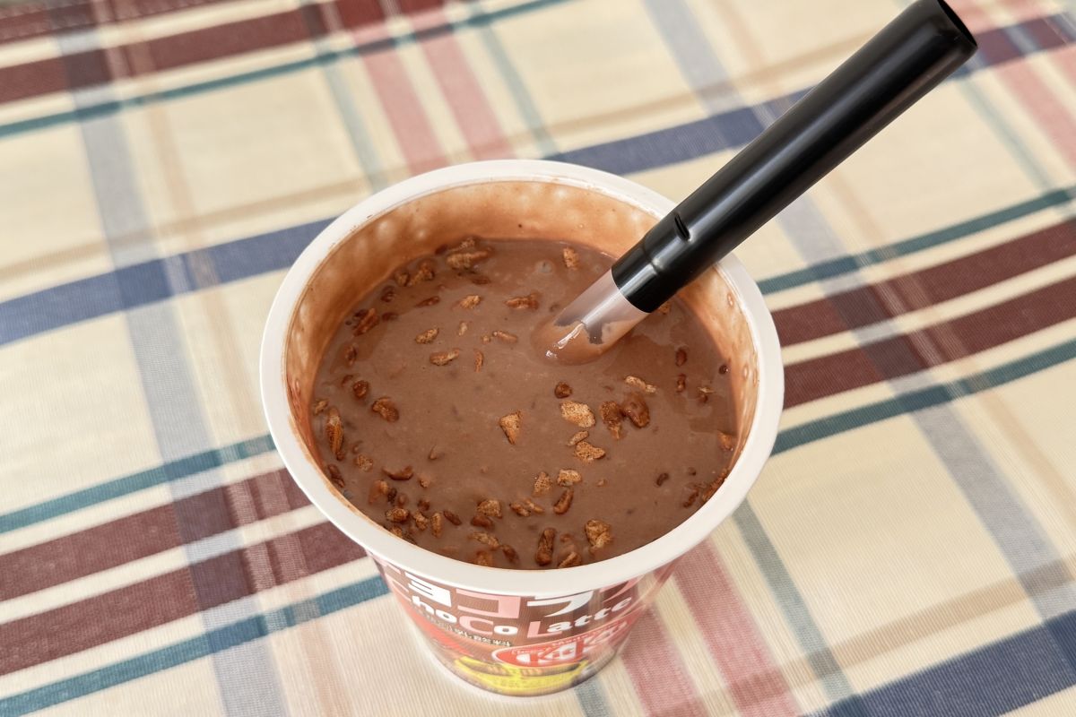 極太ストローで吸い込むと、とろりとしたチョコレートドリンクがドドっと口の中に流れ込んできます。その中にザクッザク食感のクランブルが混ざっていて、まさに新食感!